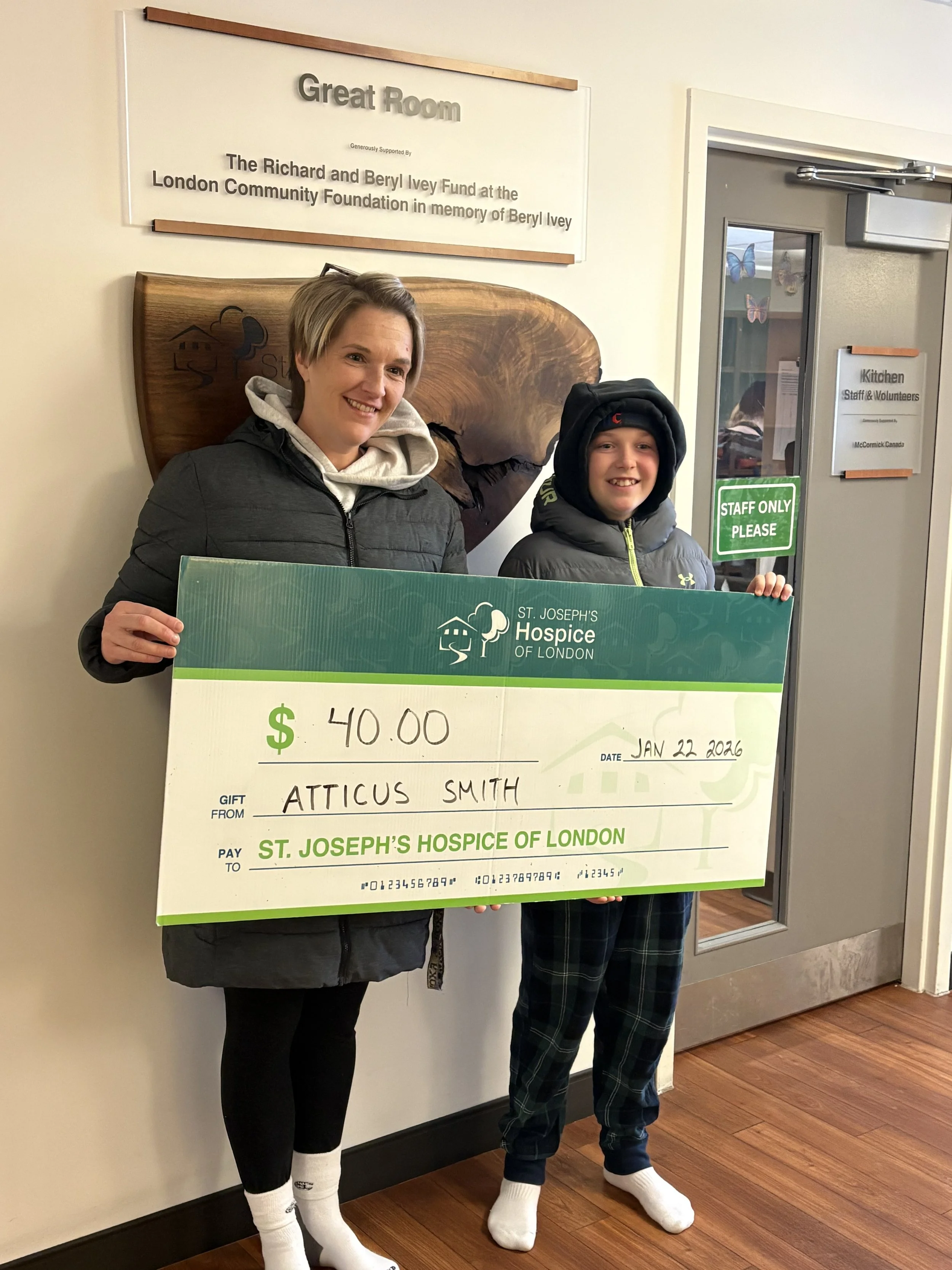 Atticus and his mom recently visited hospice to donate the $40 he raised, a gift filled with love, memory, and purpose. One day, he hopes to volunteer here himself.