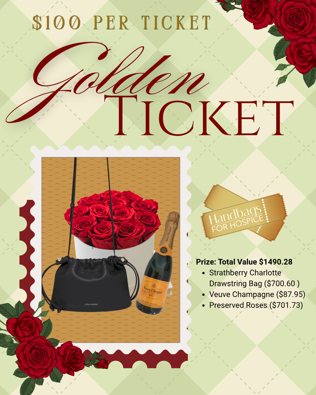 Get your Golden Ticket, support compassionate care, and just maybe you will be the lucky one to walk away with a luxury handbag for $100!